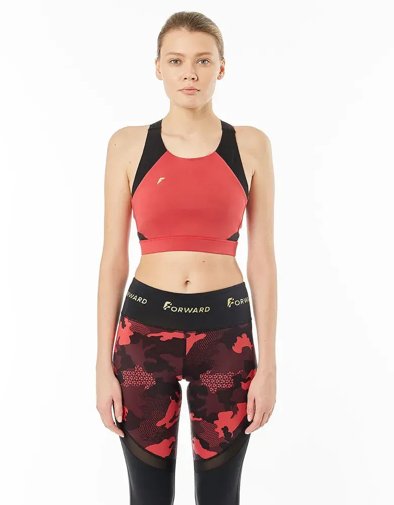 Топ FORWARD красного цвета из быстросохнущего материала с технологией DRY-PLUS обеспечивает комфорт во время тренировок. Вставки из сетчатого полотна на передней, задней частях и по бокам добавляют стильности. Лиф заканчивается узкой деталью в виде пояса. Материал быстро сохнет после стирки, отводит влагу при активном движении, сохраняя сухость под одеждой. Нанесения: фольгированный принт "F", светоотражающий принт "Dry Plus".